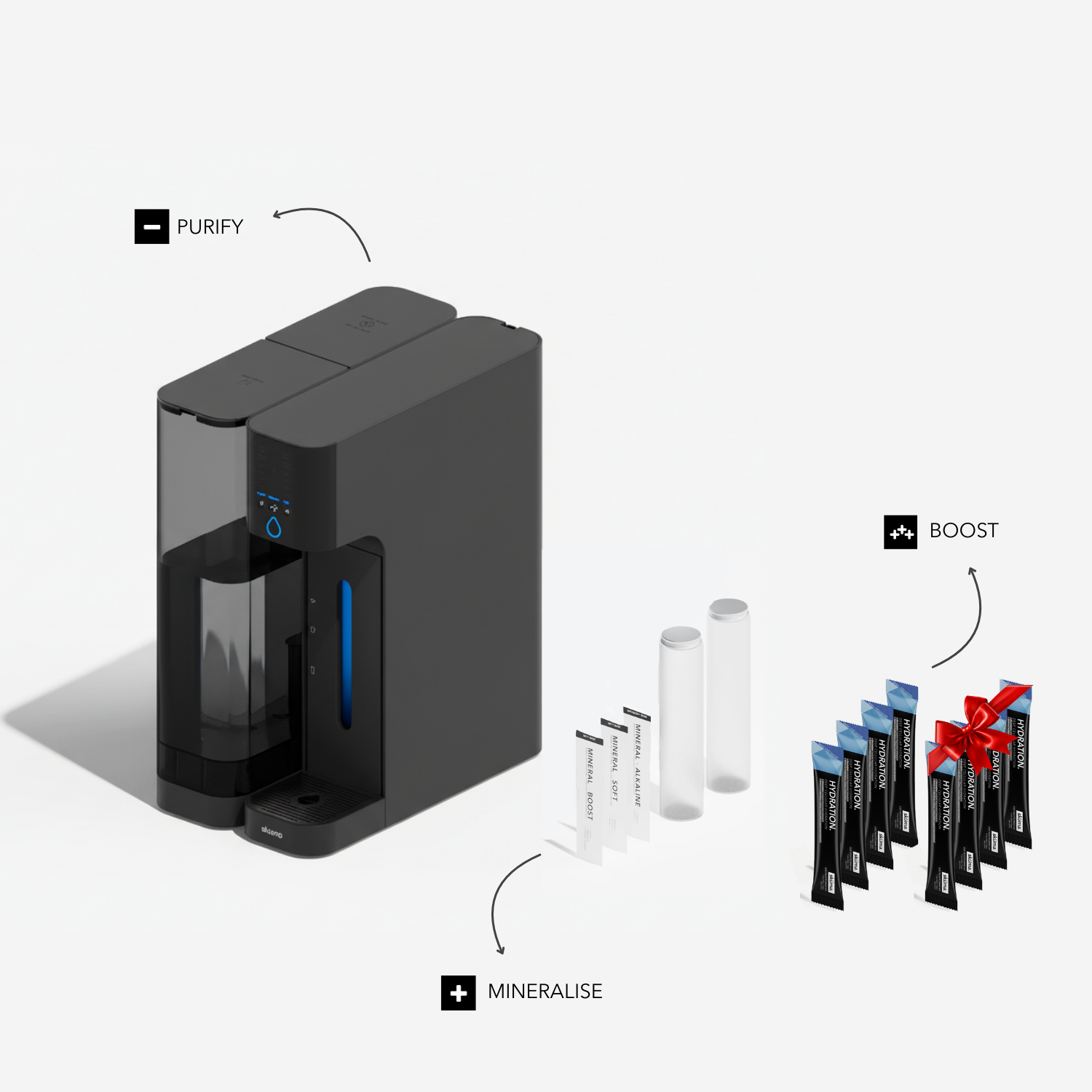 No plumbing. No complexity. Just replace the filter once a year and enjoy pure, clean water, ready for personalisation.